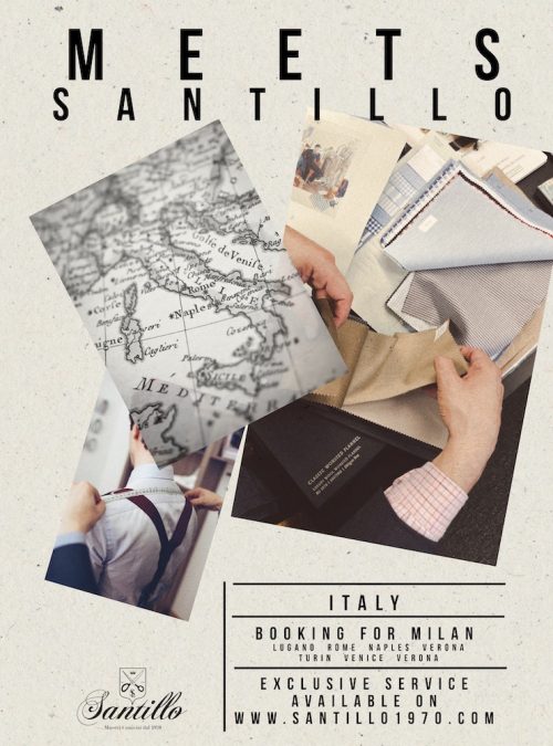 In the club house or hotel in major Italian and European cities for political businessmen or professionals who want to conveniently order clothes or shirts in their office or home, and be guided in their choice of exclusive garments. The customer will be reached by a specialist who will take with him all the Santillo style and experience to illustrate the fabric differences and advise the best depending on the occasion. With the help of the expert, the first step will be to be careful to take the measuraments, and then continue with the choice of the model, its slowness, aplomb. The expert will guide you through the stages of selecting fabrics based on the occasions, then guide you through the selection and finishing of the details by understanding everything you need, while giving you a taste of Santillo’s rich tradition and history.