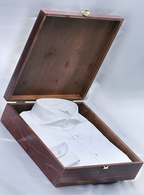 The hand-cut and hand-restitched shirt is characterized by asymmetric buttons of sterling Australian mother-of-pearl (the varying shape of the buttons brings out the hand-made sewing of every single button).